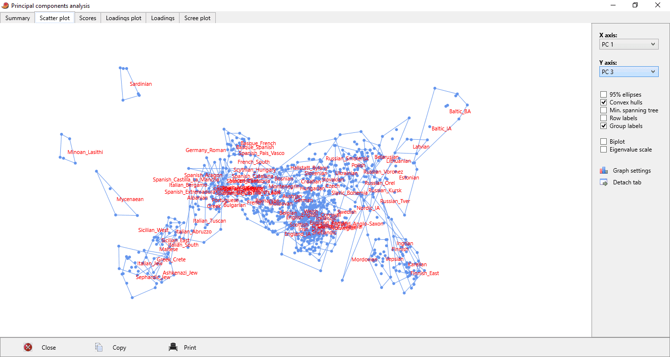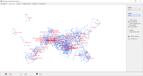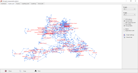To produce the intra-North European Principal Components Analysis (PCA) plot below, download this datasheet, plug it into the PAST program, which is freely available here, then select all of the columns by clicking on the empty tab above the labels, and choose Multivariate > Ordination > Principal Components or Discriminant Analysis.