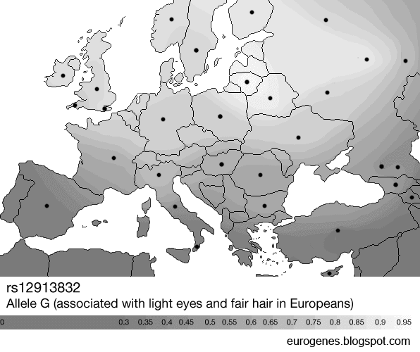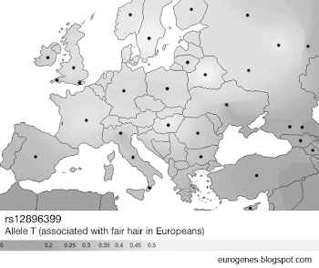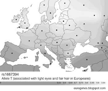 The maps below are based on three genome-wide SNPs showing high correlation with blue and green eyes and/or fair hair in Europeans. The results obviously suggest that there's an increase in hair and eye blondism from south to north in Europe, with clear peaks east of the Baltic Sea. The three SNPs are rs1667394 (HERC2 gene), rs12913832 (OCA2 gene), and rs12896399 (SLC24A4 gene).